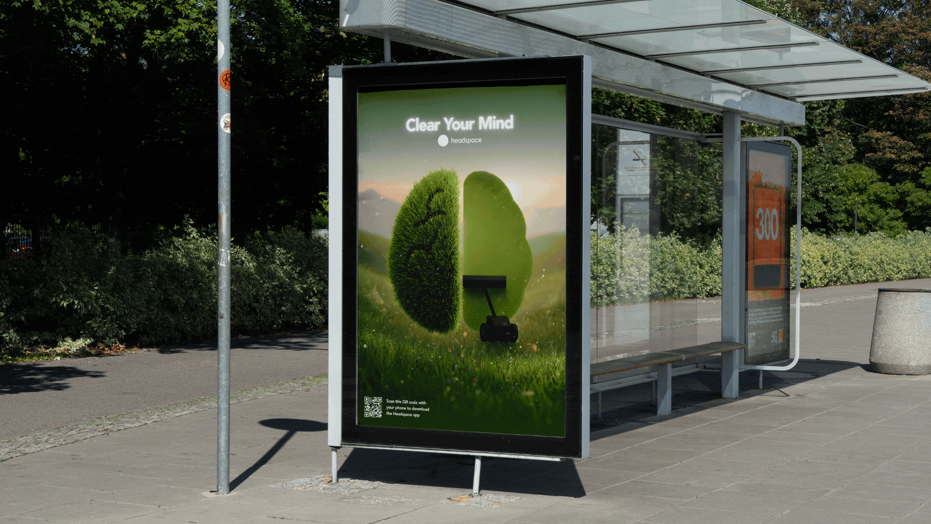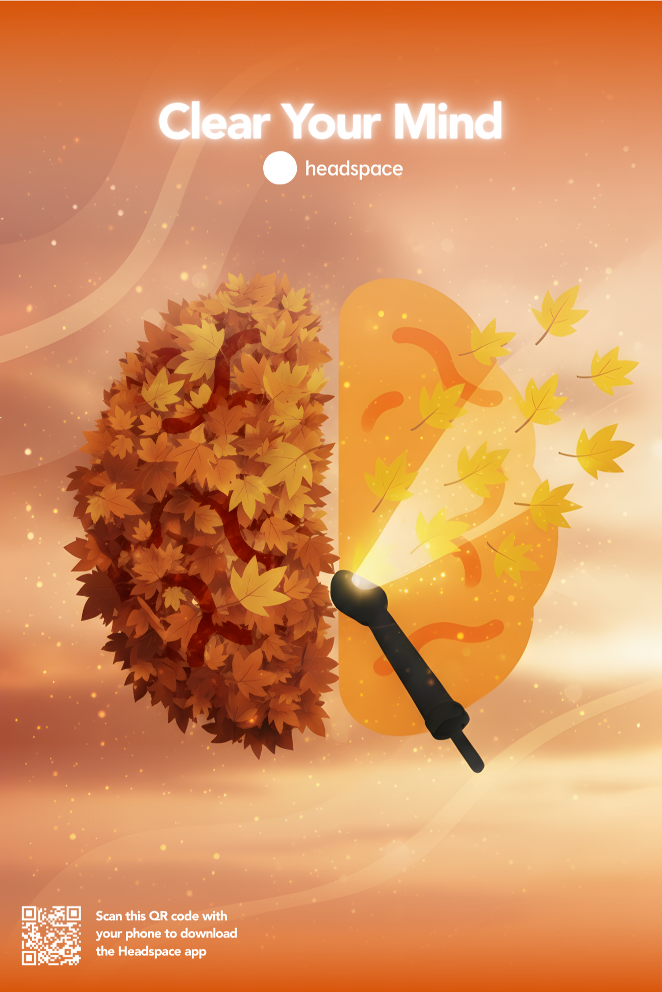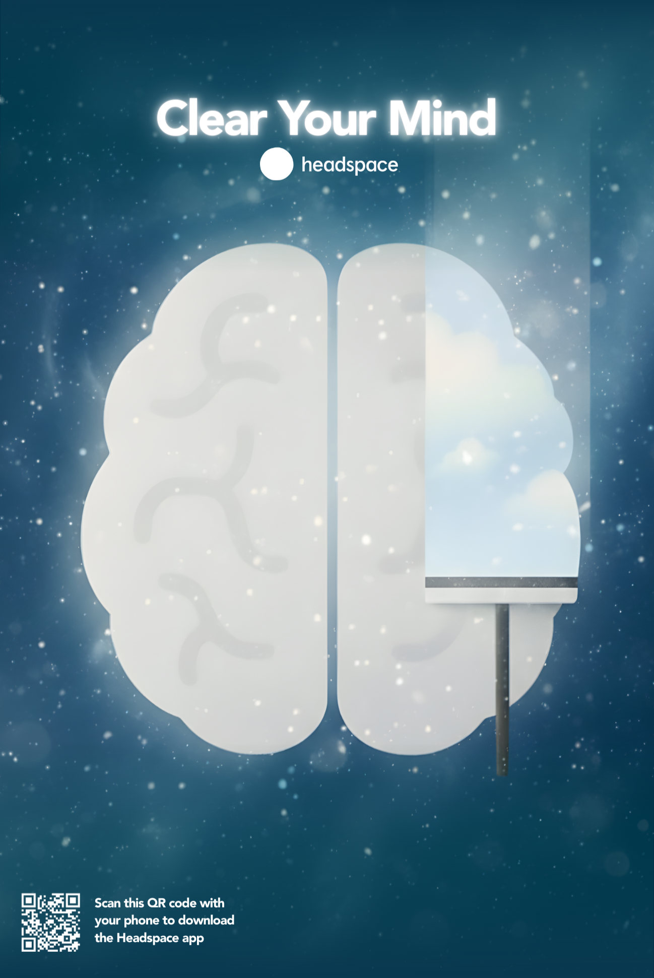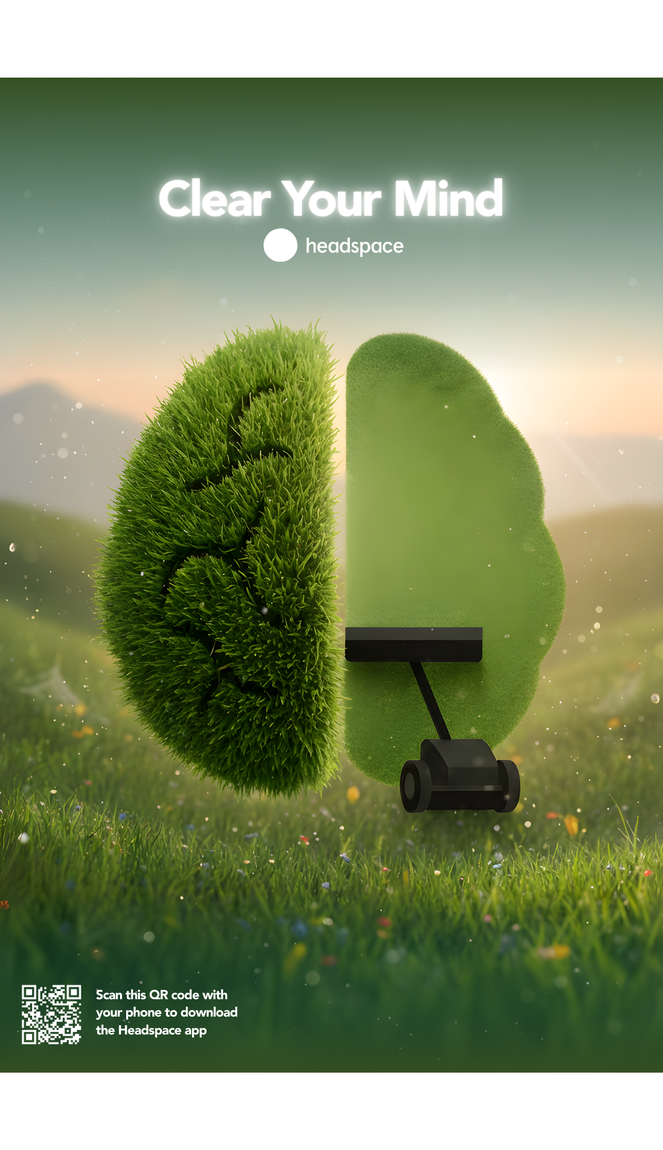 Visually clear one side of the brain, turning mental clutter into a tangible landscape, to show how Headspace creates room for calm rather than wiping thoughts away.