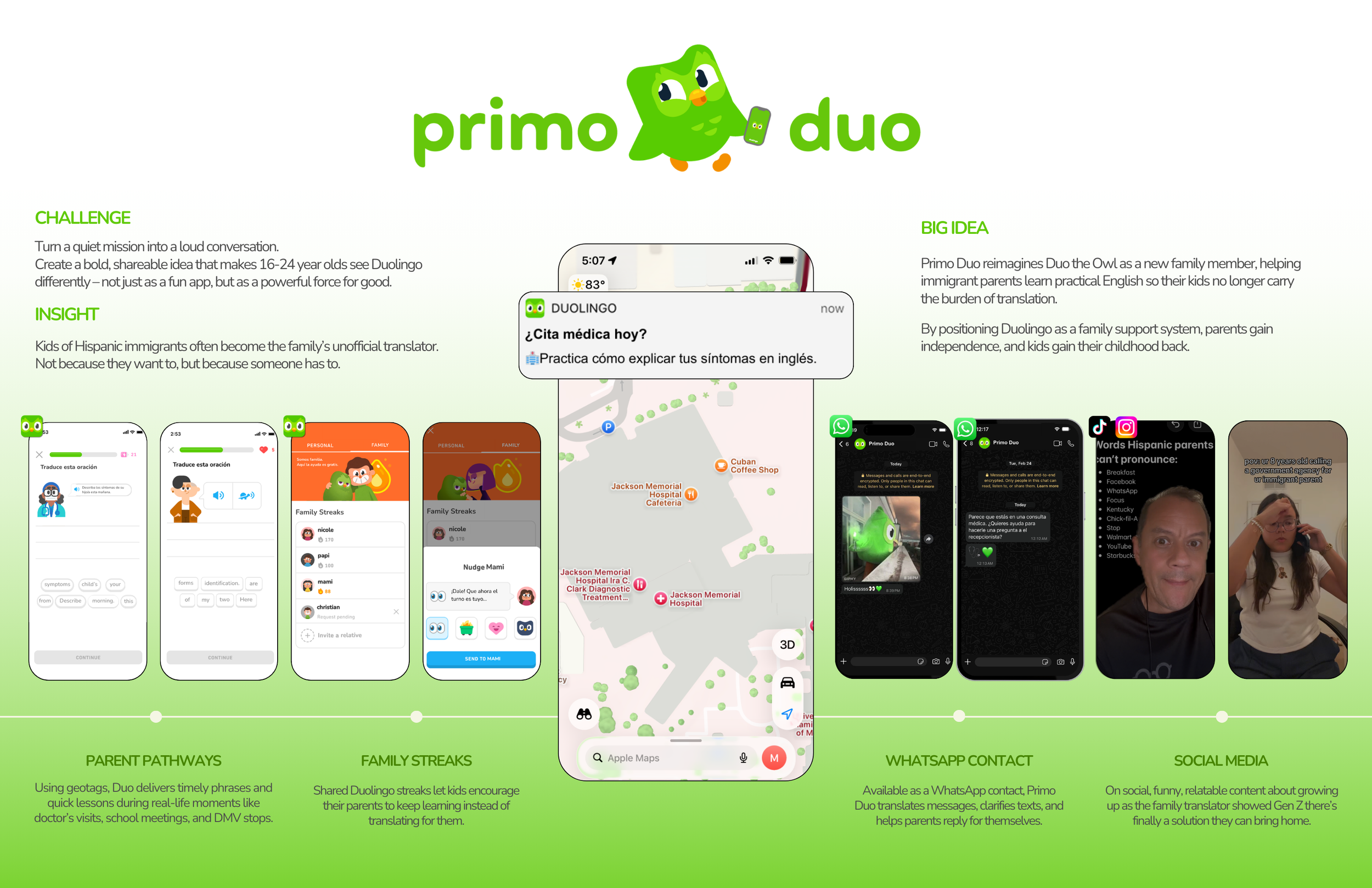 Duolingo steps in like a “primo,” helping immigrant parents learn practical, real-life English for everyday situations so they can speak for themselves, and their children no longer have to carry the role of translator.